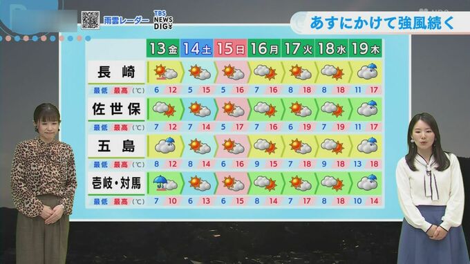 13日(金)の気温は、最低気温4℃から8℃、最高気温10℃から12℃と、風の影響で一気に冬の体感が戻ってきそうです。厚めの上着を着用してお出かけください。卒業式シーズンでもありますが、看板が倒れたり、予想以上に寒かったりする可能性があります。