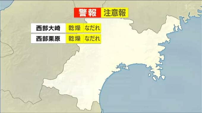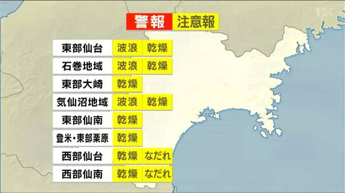 現在、沿岸の地域に波浪注意報、全域に乾燥注意報、西部になだれ注意報が出ています(全域に霜注意報が午前10時前に追加されました)。