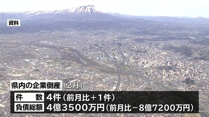 2月の岩手県内の企業倒産は4件で、前の月を1件上回ったものの、負債総額は減少しました。