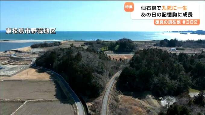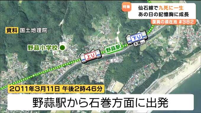 「こっちに野蒜小があった。避難しようとして、ここにとどまった方が良いと言った地元の人がいたおかげで電車の中にとどまることになって」