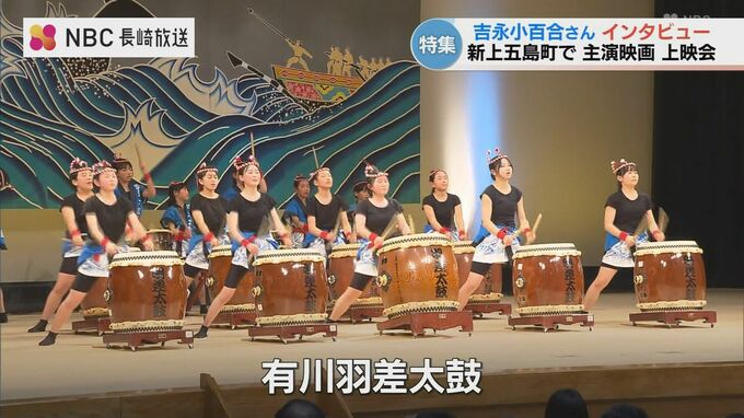 上映会の前には地元の小中学生による太鼓演奏の歓迎も受けた吉永さん。