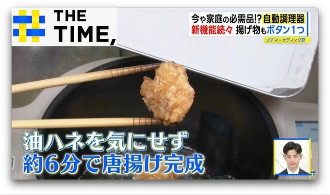 特徴は“鍋本体が傾く”こと。揚げ物をする際、一般的なものと比べて油の量が半分以下に。さらに、“内鍋が回転”するので食材が動き、仕上がりにムラもなし。油ハネを気にせず、約6分でおいしい唐揚げができちゃいます。