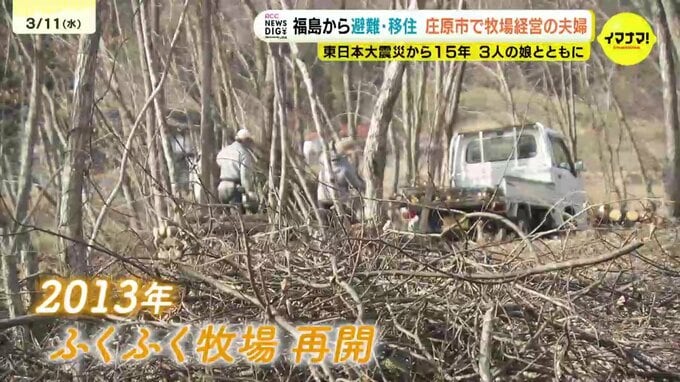 夫婦2人で4ヘクタールの山を開拓。面積は福島時代の10分の1になりましたが、2013年に「ふくふく牧場」を再開させました。