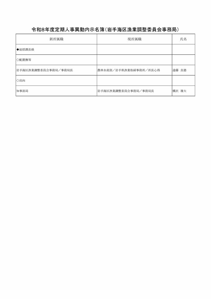 企画理事に中里裕美氏 岩手県が人事異動内示 女性管理職は過去最多の79人【企画理事級、部長級、副部長級、総括課長級 掲載】 IBC岩手放送 2026年3月13日(金) 15:01 国内 岩手海区漁業調整委員会事務局