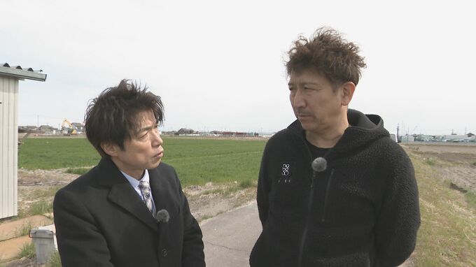 「愛知県弥富市の田んぼに来ています。きょうは春風がまだ冷たいですが、田植えの準備に入っています」