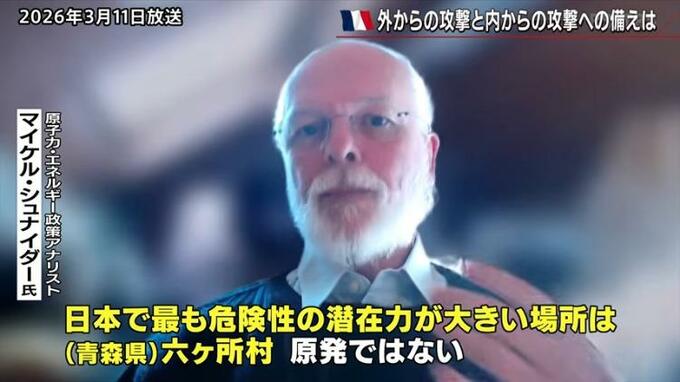 「ウクライナ戦争でも見てきたように攻撃用ドローンだけではない。観測用ドローンも大きな問題だ。低空を飛ぶ非武装ドローンでも原子力施設の情報を取得する可能性がある。(中略)最も懸念しているのは使用済み核燃料の再処理施設(への攻撃)。最大の危険の潜在性が使用済み燃料プールに存在していることを知っているからね。そこにあるセシウムが全て放出された場合、放出量はチョルノービリの66倍に当たる。これは他の国でも同じだ。日本で最も危険性の潜在能力が大きいのは原発ではない。(青森県の)六ケ所村だ」