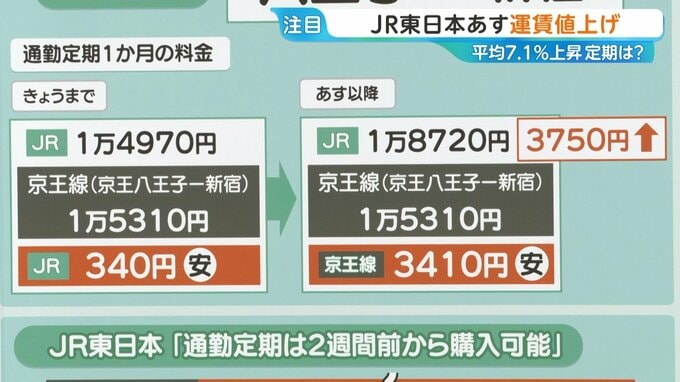 また、同じ区間で通勤定期1か月の料金を比較すると、13日まではJRは1万4970円、京王線は1万5310円と、JRの方が340円安くなっていましたが、14日以降はJRが1万5310円になるため京王線の方が3410円安くなります。