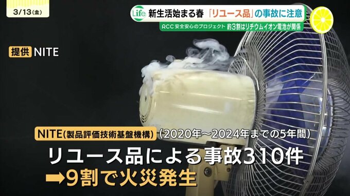 NITE(製品評価技術基盤機構)によりますと、2020年から2024年までの5年間に発生したリユース品による事故は310件。そのおよそ9割で火災が起き、死者も出ています。