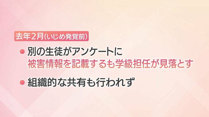 いじめ発覚前の去年2月、別の生徒がアンケートに被害情報を記載していたにもかかわらず、学級担任が見落とし、組織的な共有も行われていなかったことが分かっています。