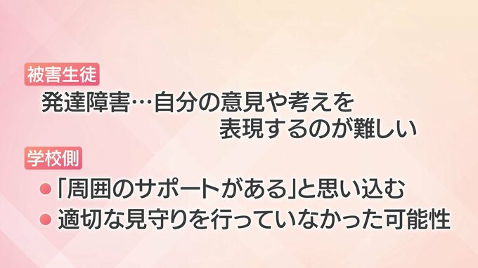 また、被害生徒には自分の意見や考えを表現するのが難しい「発達障害」がありましたが、学校側は「周囲のサポートがある」と思い込み、適切な見守りを行っていなかった可能性があるということです。