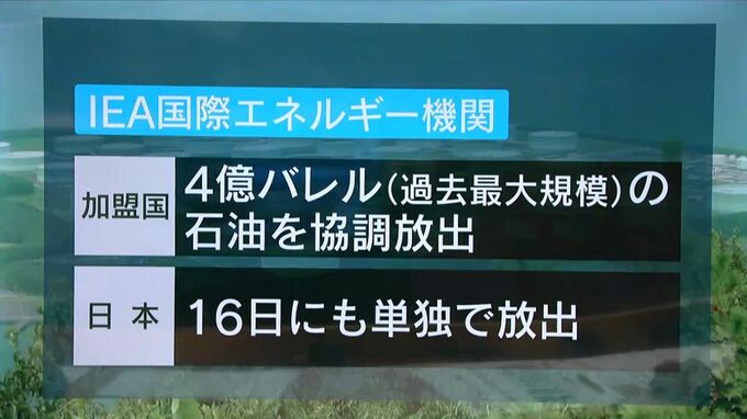 政府はこのうち、まず民間備蓄から15日分を来週16日にも放出。その後、国家備蓄から1か月分を放出する方針です。