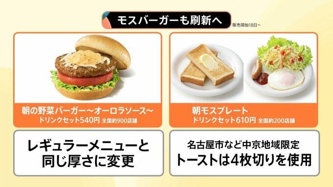 オープンから10時半まで利用できる「朝モス」でお馴染みのモスバーガーでは、以下のメニューが刷新となります。