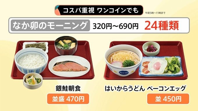 親子丼が定番の「なか卯」では、モーニングメニューが24種類もあります。価格も320円~690円と非常に安いです。
