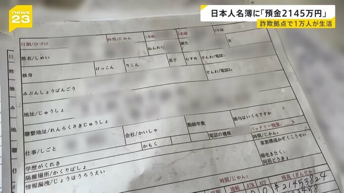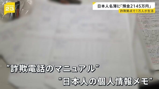 「こちらの部屋には、日本語で書かれた詐欺電話のマニュアルとみられるものや、日本人の個人情報と思われるメモ書きなどが大量に残されています」