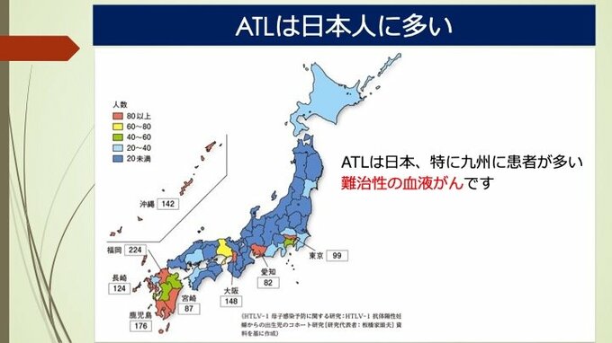 九州に多い血液がん「ATL」20年越しの“希望の新薬”が開発中止の危機に…なぜ?母乳や精液で感染、首都圏でも増加、1年以内に7割再発の難病 長崎放送 2026年3月14日(土) 12:00 国内 性交渉による感染…関東や関西で感染者増 官民あげた地道な取り組みで、母子感染は徐々に減ってきています。しかし一方で性交渉による感染は年間5000人ほどいると推計されていて、関東や関西などの都市圏では感染者が増えているという深刻な現状があります。