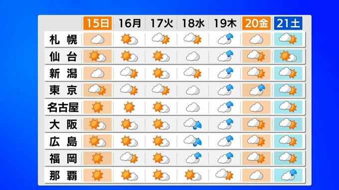 週間予報です。あすも北日本を中心に雲が残りますが、そのほかの地域はおおむね晴れるでしょう。来週水曜日から木曜日にかけては、広い範囲で雨や雪となりそうです。最高気温は平年並みか、やや高い所が多く、次第に春本番の暖かさとなるでしょう。花粉が大量に飛ぶ予想のため、花粉症の方は万全な対策をした方が良さそうです。