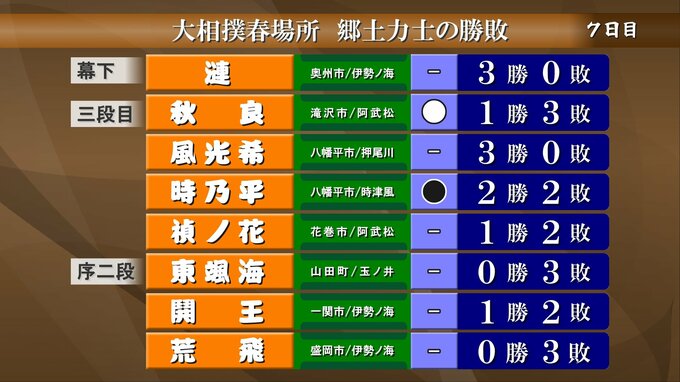 大相撲春場所7日目、14日の岩手県出身の郷土力士の取り組みの結果です。