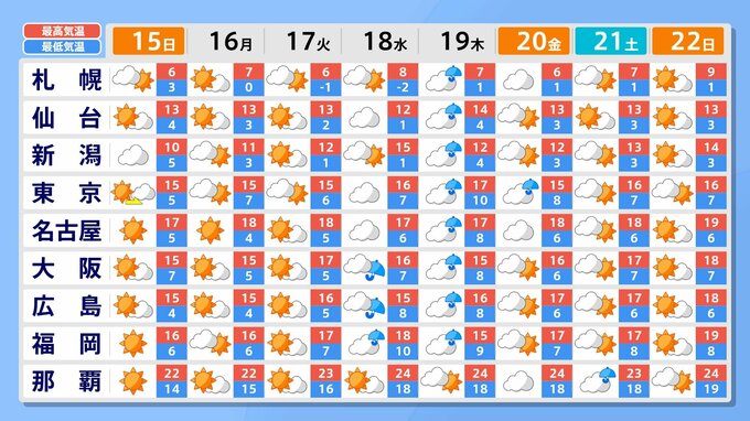 気象庁によりますと、15日(日)から16日(月)は、日本付近は高気圧に覆われる所が多くなる見込みです。17日(火)にかけて、各地で晴れる所が多くなりそうで、日差しを有効活用できそうです。