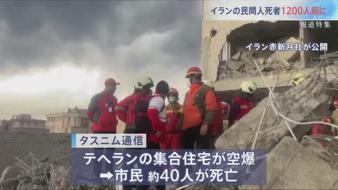 一般住宅にも被害が出ている。革命防衛隊に近い「タスニム通信」によると、テヘランの集合住宅が空爆を受け、市民約40人が死亡したという。