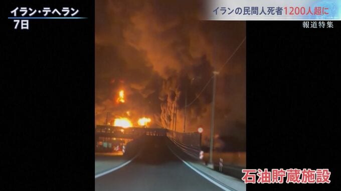 イランの首都テヘランでは7日、複数の石油貯蔵施設がイスラエル軍により攻撃された。爆発による巨大な火柱で、夜の街は赤く染まった。テヘランでは「黒い雨」が降ったという。