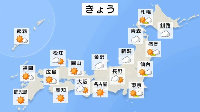 【きょうの天気】広く晴れも北海道や北陸では雨や雪が降るところが… 全国的に日差し暖かくスギ花粉の大量飛散に注意 3月15日 To view this video please enable JavaScript, and consider upgrading to a web browser that supports HTML5 video TBSテレビ 2026年3月15日(日) 12:43 国内 天気 きょうの全国天気 広く晴れ きょうは西から高気圧に覆われて、西日本と東日本は広く晴れるでしょう。北日本は雲が広がりやすく、北海道や北陸で雨や雪の降る所がありますが、降り方は弱い見込みです。南西諸島は晴れ間がある予想です。