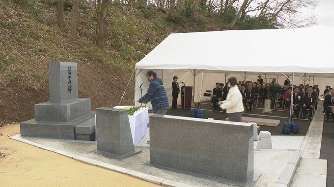能登半島地震の土砂崩れにより墓地の一部が崩落した石川県金沢市の奥卯辰山墓地公園で15日、慰霊碑の完成式典が開かれました。