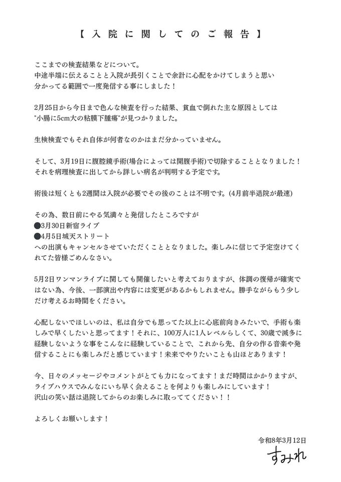 3月12日に、すみれさんは「【入院に関してのご報告】」と題した文書で「ここまでの検査結果などについて。中途半端に伝えることと入院が長引くことで余計に心配をかけてしまうと思い分かってる範囲で一度発信する事にしました!」と、投稿。