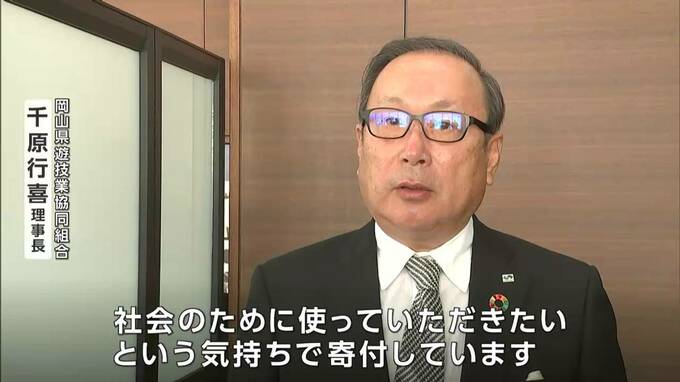 RSKを訪れたのは岡山県遊技業協同組合の千原行喜理事長ら3人です。組合で集めた浄財25万円をRSK山陽放送の里見俊樹社長に手渡しました。