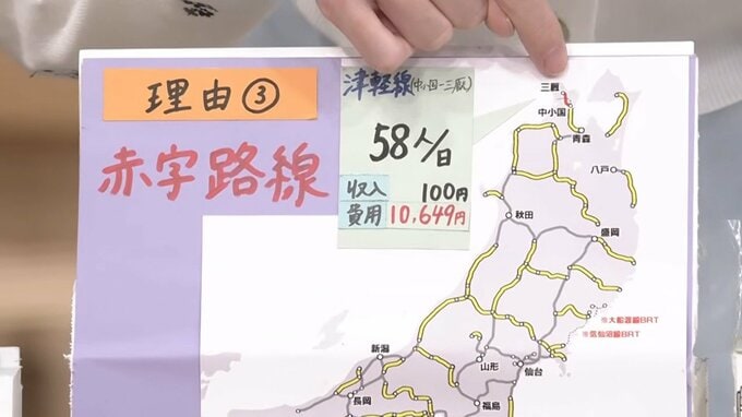津軽線のとある区間は1日に58人しか利用しておらず、100円稼ぐのに1万円以上かかる状況だといいます。