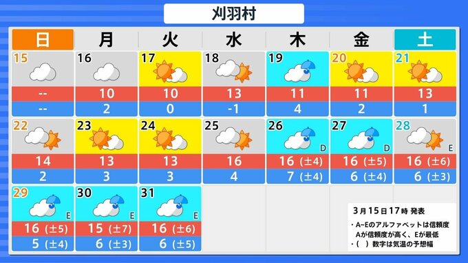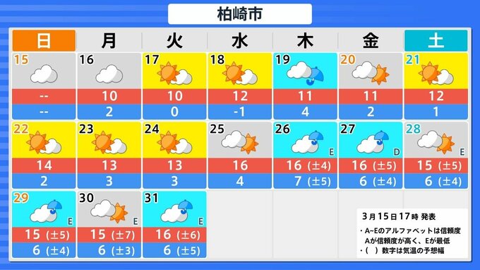 【新潟の天気】次の週末にかけて晴れる日が多くなる見込み 19日(木)ごろは前線などの影響で一時的に雨や雪【今後16日間の天気予報・15日午後9時更新】 新潟放送 2026年3月15日(日) 21:00 中越エリア(長岡・柏崎周辺)の16日間天気予報