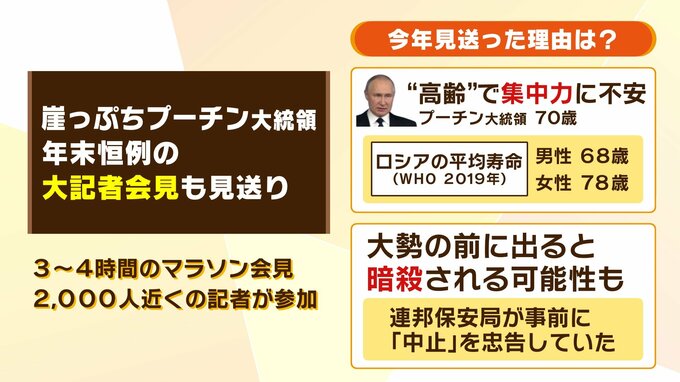 ーー崖っぷちのプーチン大統領、年末恒例の大記者会見も見送りとなりました。3時間~4時間の非常に長い会見なんですが、記者が約2000人近く参加をして、様々な質問をするものです。プーチン大統領は現在70歳です。ロシアの平均寿命は男性68歳、女性78歳と10歳の差があるのですが、平均寿命を超えているということでやっぱり心配だということだそうですね?