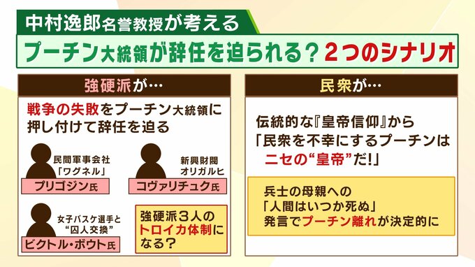 「プリゴジン氏はプーチンの料理人と言われていた人です。2人目はビクトル・ボウト氏、アメリカの刑務所に入っていましたが、アメリカの女子バスケ選手と囚人交換で帰ってきた主の証人と言われている人。コヴァリチュク氏はプーチン大統領のコンシェルジュと言われてる人たちなんですね。1990年代以来の友人で、プーチンの金庫番とも言われている。プーチン氏個人のお金や女性関係で、そういうところを全部握ってる人だというこの3人が、どうやら新しいグループを作ってきて、強硬派になってきていると。どうやらプリゴジン氏がプーチン大統領の後継者になりたいと、自分の政党『保守政党』を作る準備を始めてるということです。2024年にロシアで大統領選挙がありますから、プーチン大統領の後継をプリゴジンさんが狙っている。ただ、スポンサーがいるんですね。コヴァリチュク氏は元銀行の支配人ですので大変なお金持ちで、コヴァリチュク氏がプリゴジンさんのスポンサーになって後継者作り、この3人の強硬派で進んでいるんじゃないかと。この3人がプーチン大統領に『今回の戦争で作戦が失敗した』ということで辞任を迫って、プリゴジンさんが後継者になっていくシナリオが作られてるんじゃないかという話がもうロシアの中で公然と出てるんですね」