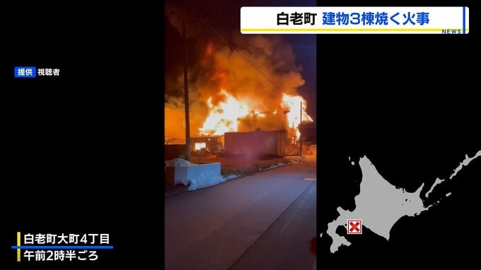 16日未明、北海道白老町の住宅地で、建物3棟を焼く火事がありました。激しく立ち上る炎と煙…16日午前2時半ごろ、北海道白老町大町4丁目の住宅で「2階から火が出ました。炎と煙が上がっているが自分は無事です」と…