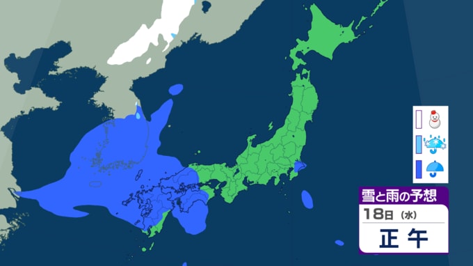 18日(水)になると、前線を伴った低気圧が西日本へと進んできます。低気圧や前線に向かって暖かく湿った空気が流れ込む影響で、西日本では大気の状態が不安定になります。西日本では18日(水)は、落雷や突風、急な強い雨に注意が必要です。
