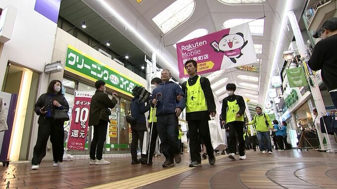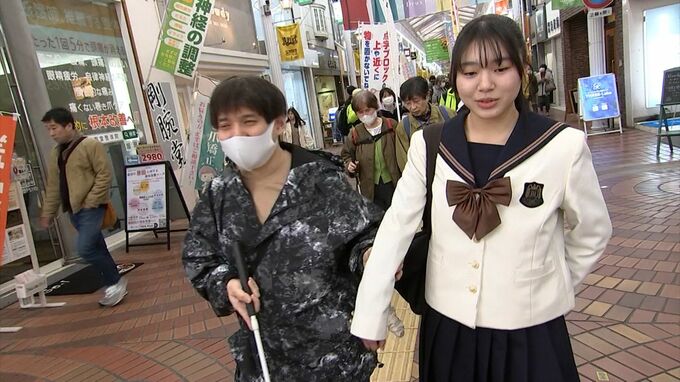 要望から6年、視覚障害者が待ち望んでいた設置です。3月18日の「点字ブロックの日」を前に表町商店街で開かれたイベントには、視覚障害者やボランティアの高校生など約100人が参加しました。
