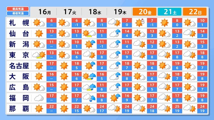 また19日(木)には低気圧が本州付近を通って日本の東へ進むため、本州の広い範囲で雨が降るでしょう。北日本や東日本日本海側でも雨や雪が降る所が多くなる見込みです。