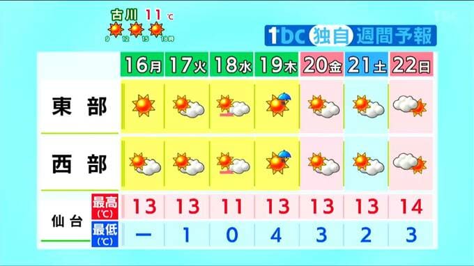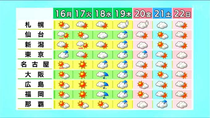 17日以降も高気圧に覆われて晴れる日が多いでしょう。木曜日は低気圧の影響で朝にかけて一時雨が降りそうですが、降る時間は短い見込みです。