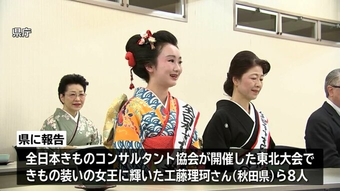 16日は「全日本きものコンサルタント協会」が開催した東北大会で、総合トップの「きもの装いの女王」に輝いた工藤理珂さんら関係者8人が、文化スポーツ部の菊池芳彦部長に結果を報告しました。