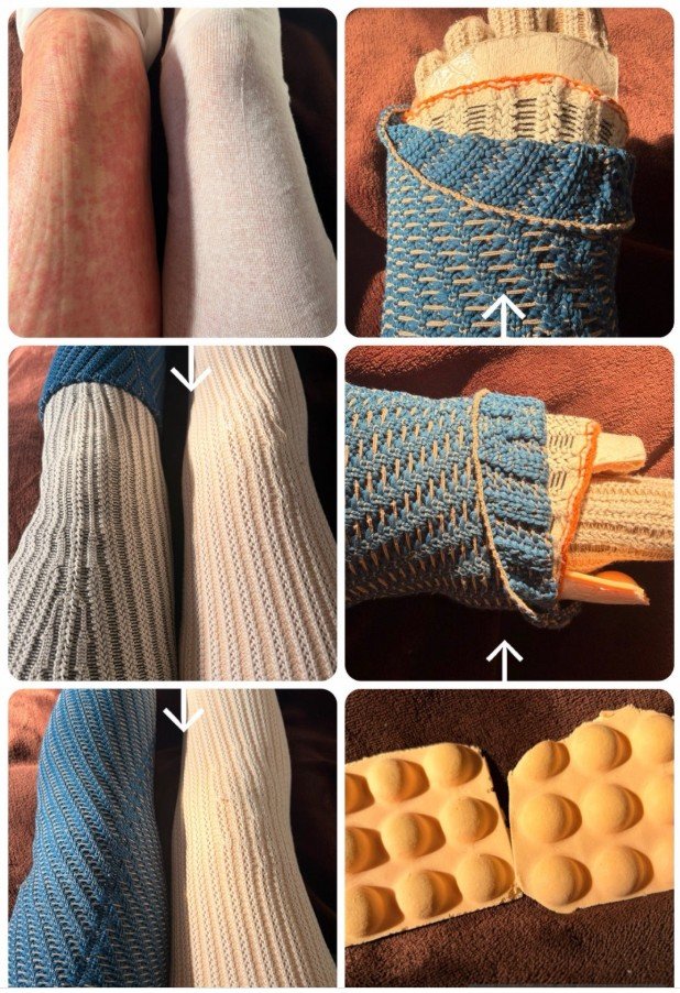 そのため、独自の対処法を実践。具体的には、まずガーゼで脚をカバーし、その上からコットンのエアボウェイブを履きます。浮腫みがある部分にはリムスパイラルエニタイムを重ね、足先には更にクッションを重ねてリンパの流れを促進させる方法を取ったとのことです。