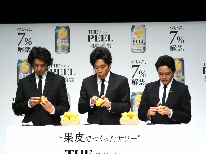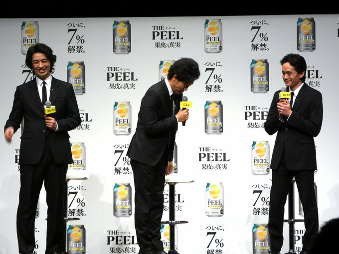 俳優の大泉洋さん、斎藤工さん、池松壮亮さんが16日、『“果皮でつくったサワー”「THE PEEL」商品説明会&新TV-CM 発表会』に登壇しました。