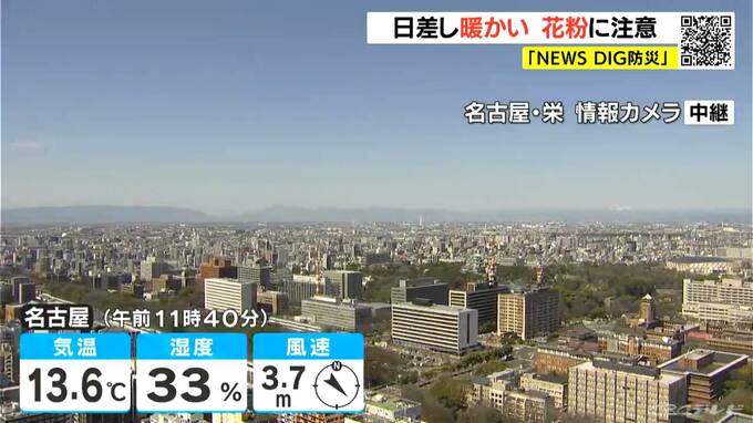 正午前の名古屋市内は、すっきりとした青空が広がっています。現在の気温は13.6℃で、空気はカラッとしています。