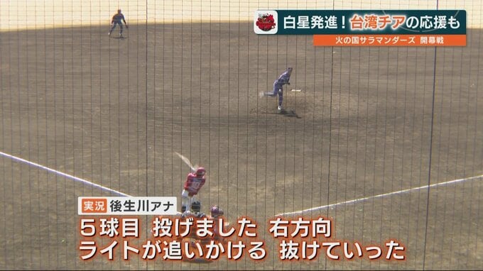 ラジオ実況「投げました、打ちました。右方向。ライトが追いかける大きい。ライトが捕ってアウト。3塁ランナーの寛知がスタート、ホームイン。火の国サラマンダーズ3点目です」