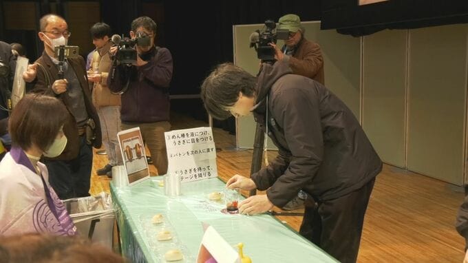 お菓子の「因幡の白うさぎ」に赤い目を描き入れ次の人へ交代していくというもので、赤い目となる「野菜エキス」が入った容器が、バトン代わりです。