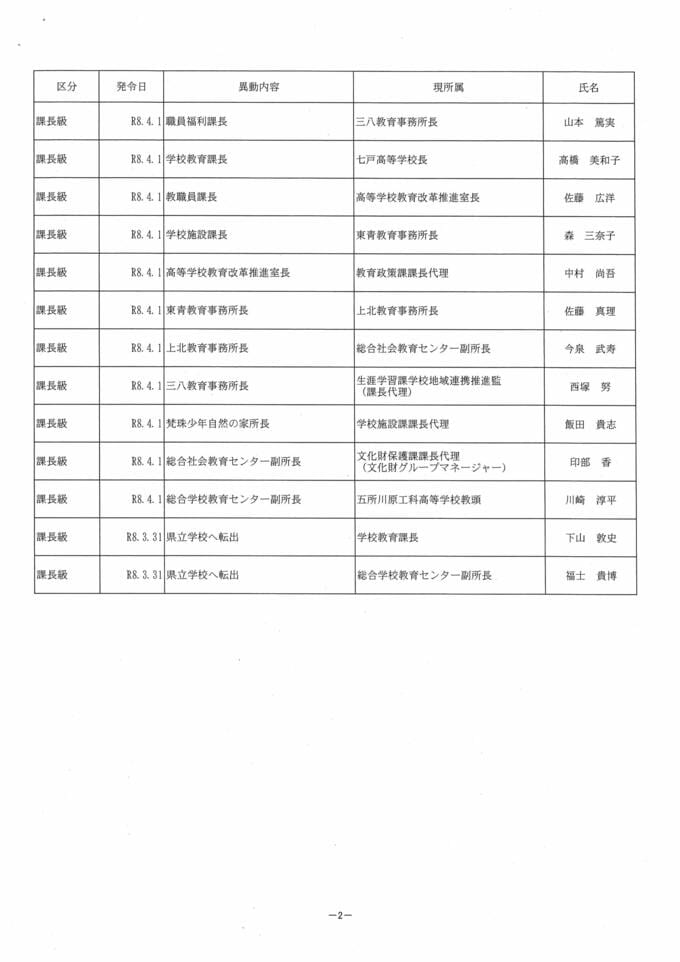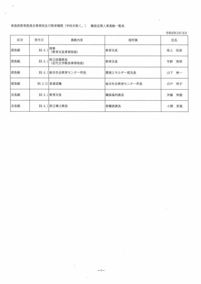 青森県教職員人事異動2026 県教育委員会事務局・教育機関(学校除く) 一覧【名簿全掲載】 青森テレビ 2026年3月18日(水) 17:00 国内 青森県 教職員人事異動一覧2026 【県教委事務局・教育機関(学校除く)】① 【記事を最初から読む】