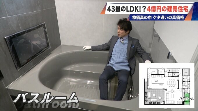 2階には、20畳のバルコニーと43.5畳のリビング・ダイニング・キッチンに、テレビ付きのバスルームも完備。