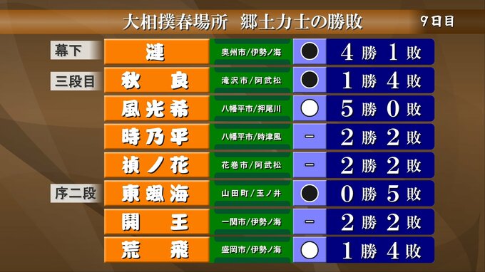 続いては大相撲春場所9日目、郷土力士の取り組みの結果です。