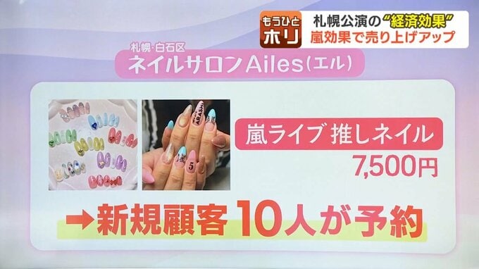 去年12月にオープンした札幌市白石区のネイルサロンAiles(エル)。嵐のライブに合わせて、推しネイル(7500円)を始めたところ嵐効果で新規顧客10人から予約が入ったということです。