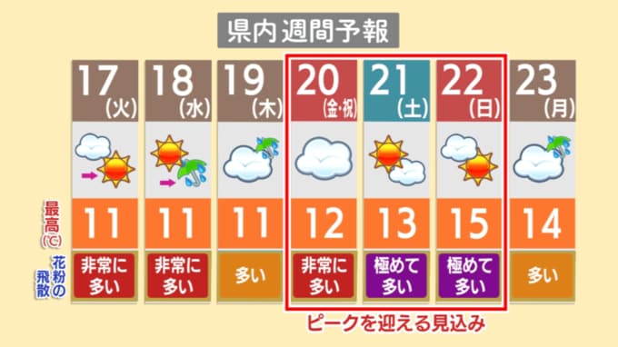 新潟県内の週間天気予報によりますと、17・18日の飛散量が『非常に多い』見込みです。さらに21日(土曜日)と22日(日曜日)には『極めて多い』と、飛散量のレベルを示す5段階のうち“最も高い”ランクの日が続きそうです。