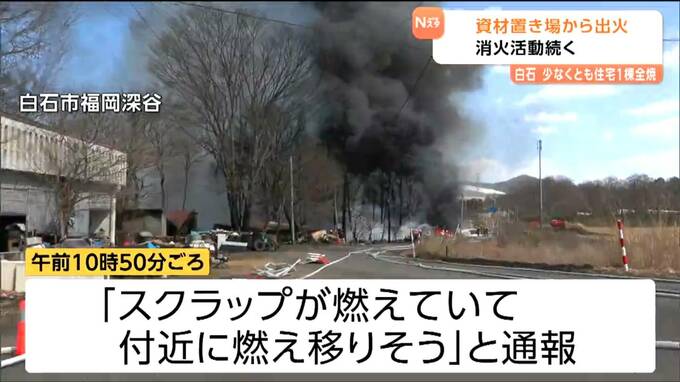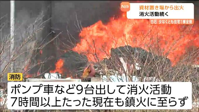 16日午前、宮城県白石市内の資材置場から火が出ました。火は付近の建物にも燃え移って、少なくとも住宅1棟が全焼し発生から7時間以上が経った今も消火活動が続けられています。