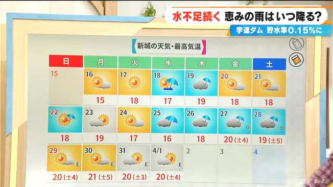新城市の今後の雨の予想を見てみると、今週、そして来週も降ります。まとまった雨にはなりますが、これでもまだまだ足りません。